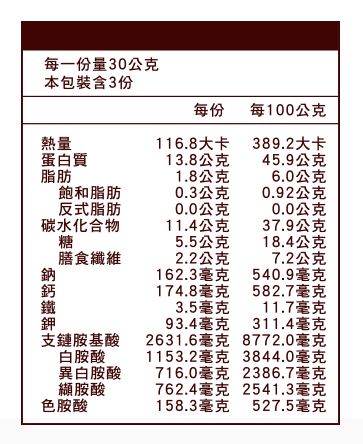 成分:豌豆蛋白、草莓果汁粉(草莓濃縮汁、麥芽糊精)、冰糖粉、蜜糖草莓粉(蔗糖、冷凍真空乾燥草莓)、奇亞籽、紅藜麥、白藜麥、洋車前子殼、菊苣纖維、海藻鈣、寒天粉
