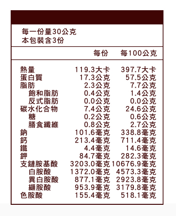 成分:豌豆蛋白、紅藜麥、白藜麥、赤藻糖醇(甜味劑)、海藻鈣