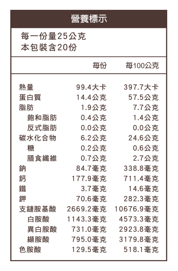 成分:豌豆蛋白、紅藜麥、白藜麥、赤藻糖醇(甜味劑)、海藻鈣